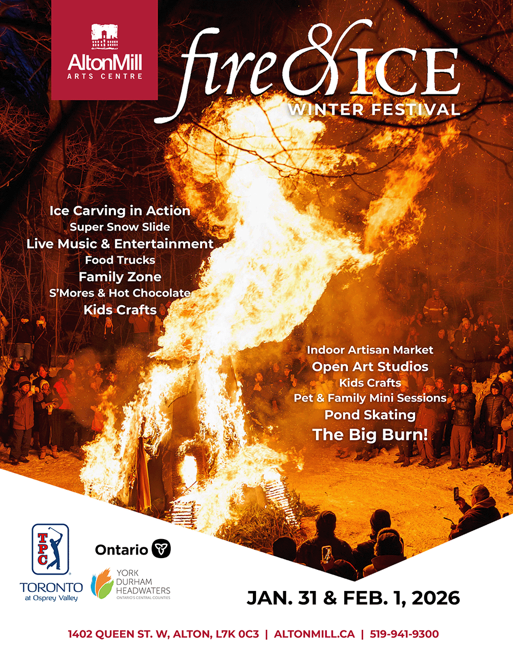 Join us at the Alton Mill’s 16th annual Fire & Ice Festival presented by TPC Toronto at Osprey Valley for a high-energy winter celebration packed with live outdoor fire performances, ice carving, skating on the millpond, cozy food with Windrush wines, family activities, and magical moments around every corner.